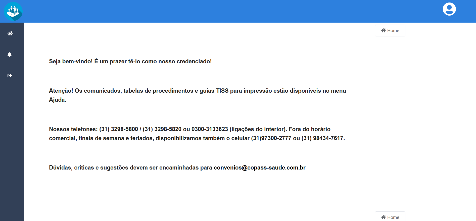 exibe o Menu Principal, onde terá todas as funcionalidades que o prestador possui acesso e na parte à direita a identificação do usuário.